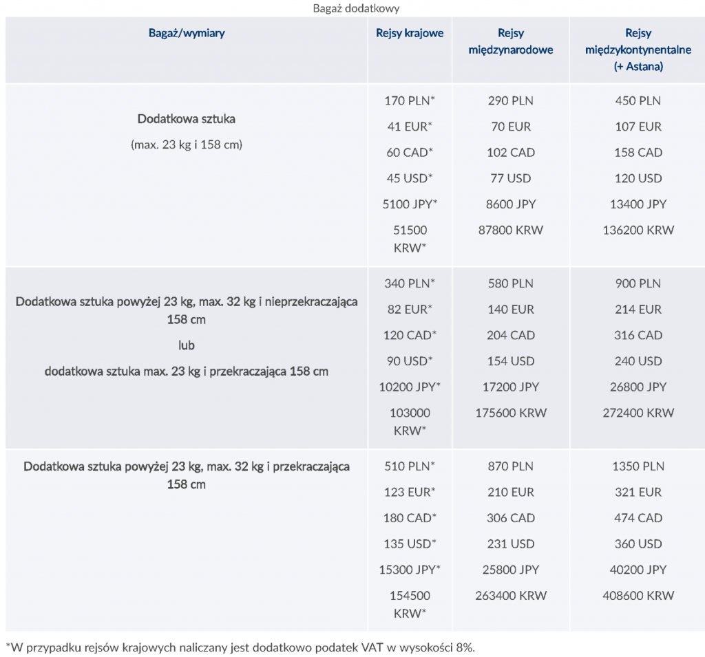 Wysokość opłat dodatkowych za dodatkowy bagaż rejestrowy przedstawia poniższa tabelka: