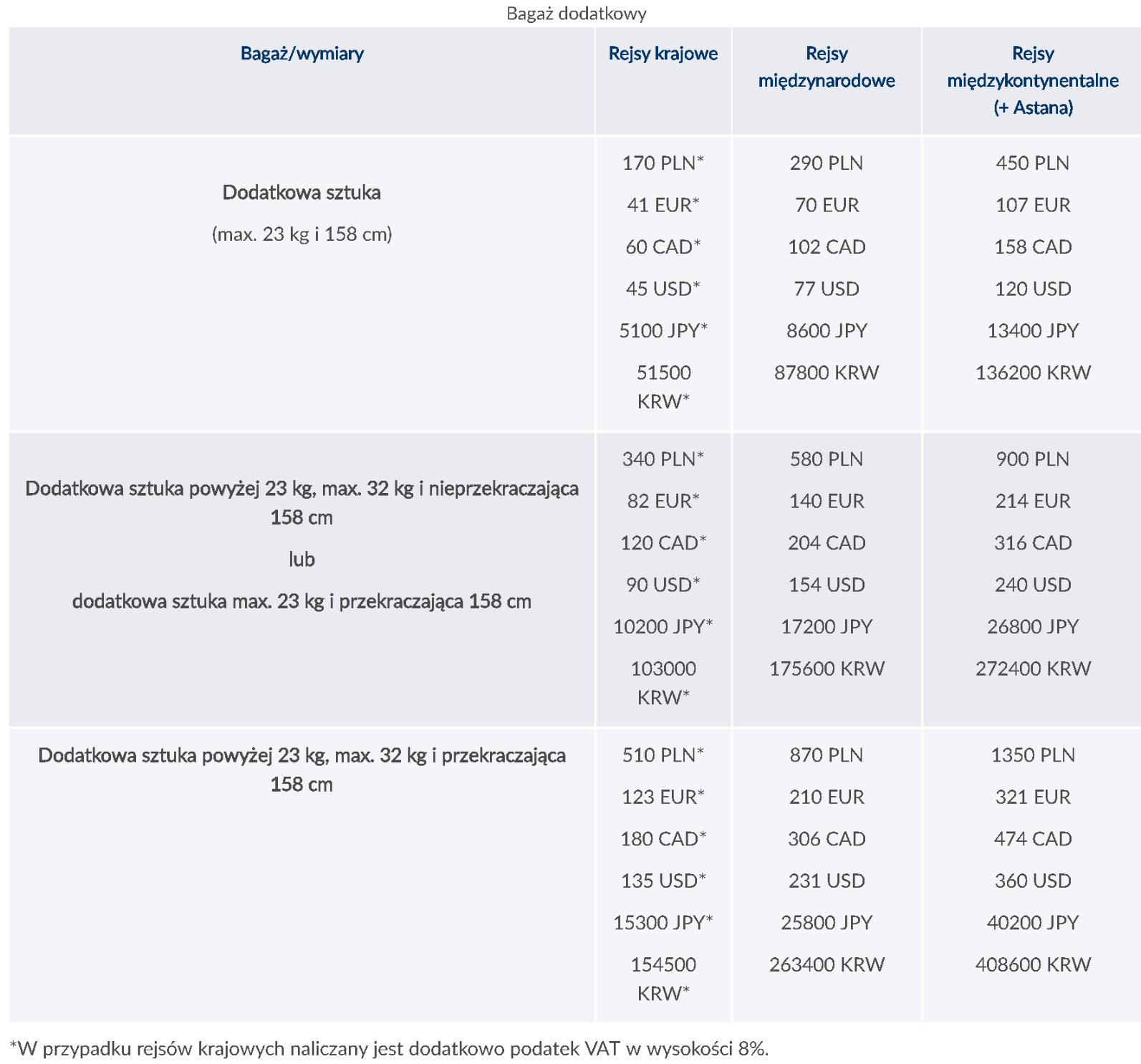 Wysokość opłat dodatkowych za dodatkowy bagaż rejestrowy przedstawia poniższa tabelka: